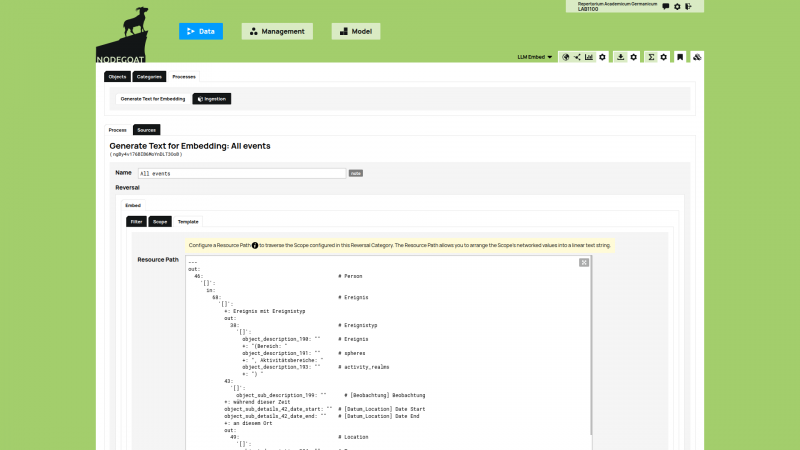 Next, the textual representation of each Object is sent to an LLM in order to create an embedding for each Object. The communication between nodegoat and an LLM is achieved by making use of Linked Data Resources and Ingestion Processes.[....]