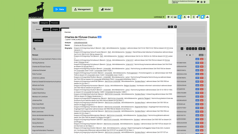 We have extended nodegoat in order to be able to communicate with large language models (LLMs). Conceptually this allows users of nodegoat to prompt their structured data. Technically this means nodegoat users are able to create vector embeddings for their objects and use these embeddings to perform Retrieval Augmented Generation (RAG) processes in nodegoat.